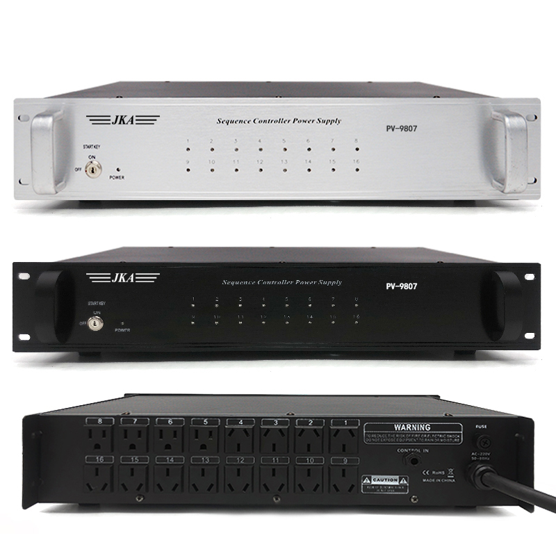 PV-9807十六位电源时序控制器 型号 PV-9807 输出功率 25W 电源 AC 220±5 50-60HZ 尺寸 88X482X390mm 重量 7Kg 产品特点: /十六位上电控制插座 /可选上电插座数量 /插座依次上电,反向关电,每路最大承受1000W